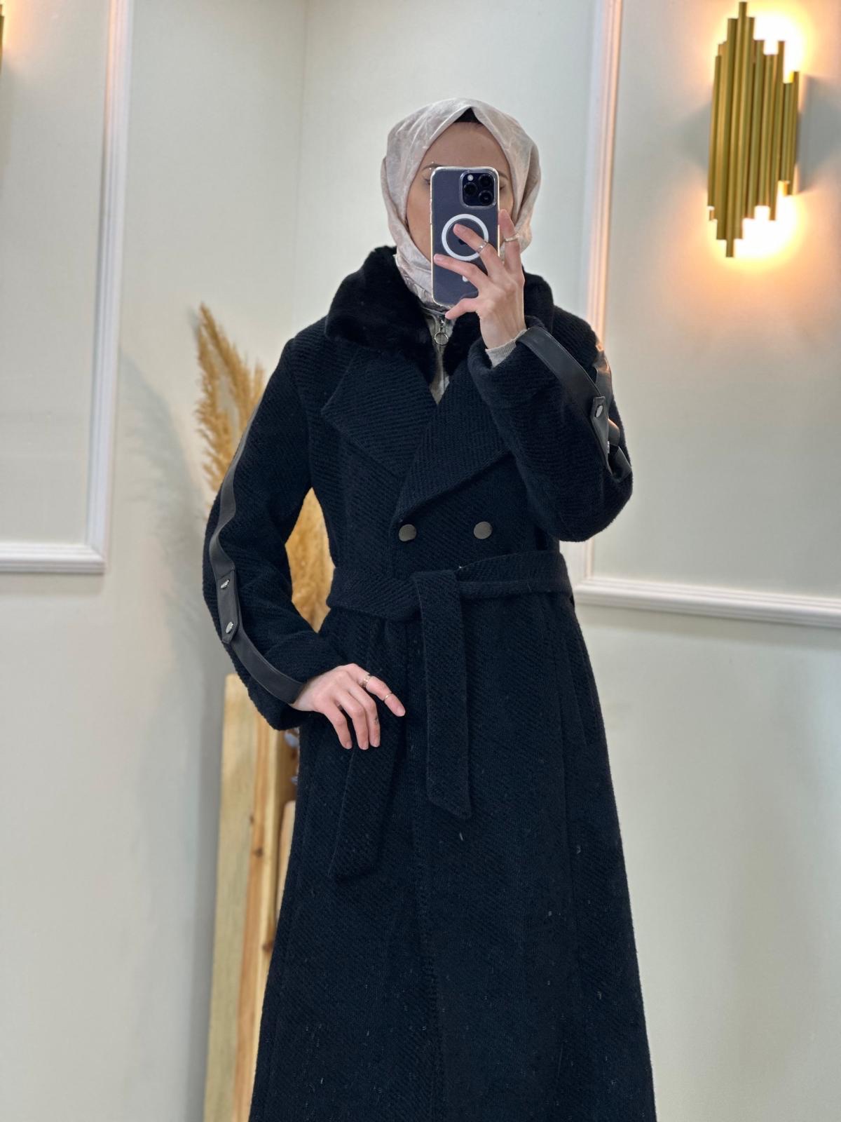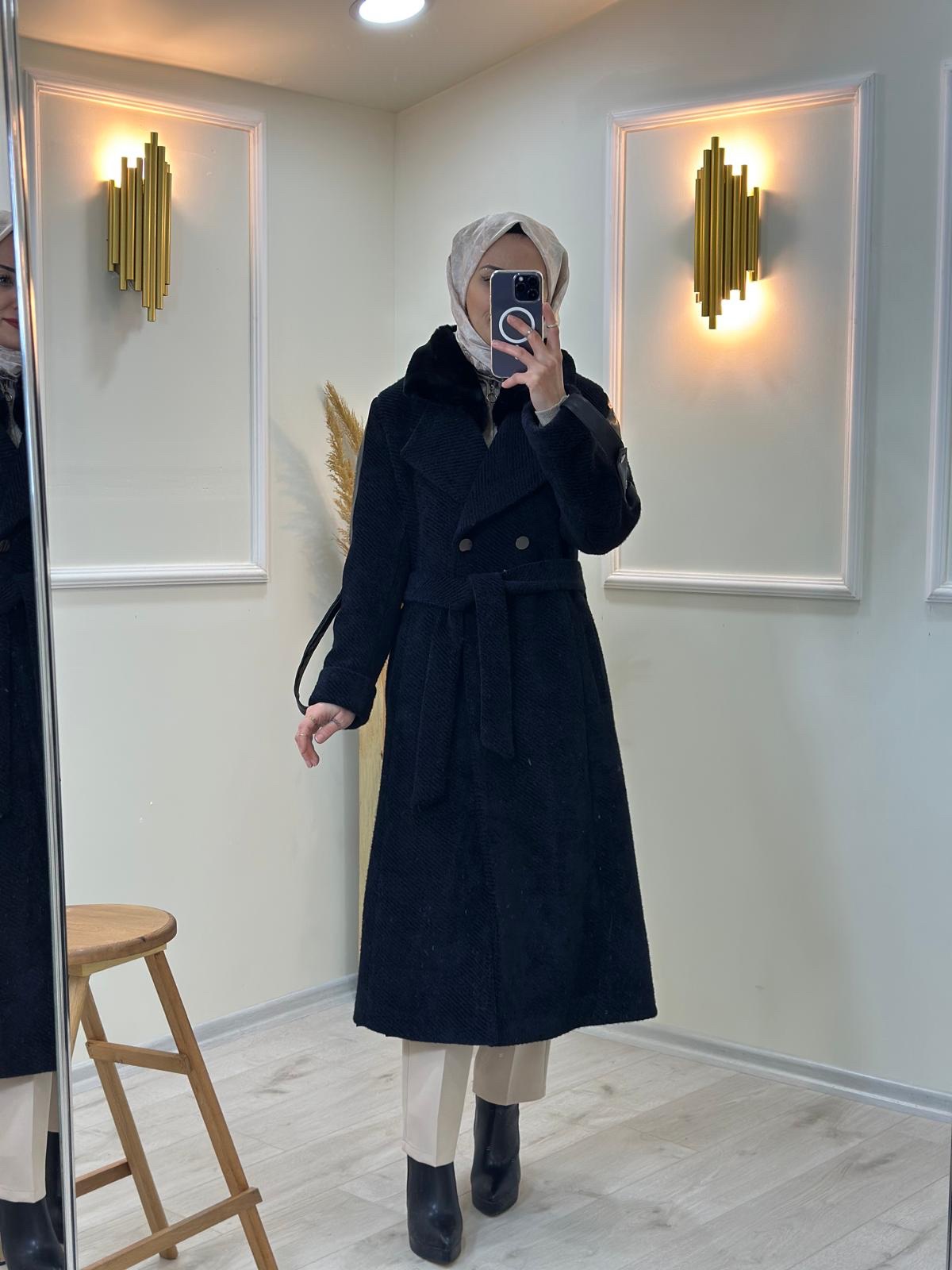 -10%Kuşaklı Kürk Yaka Kaban